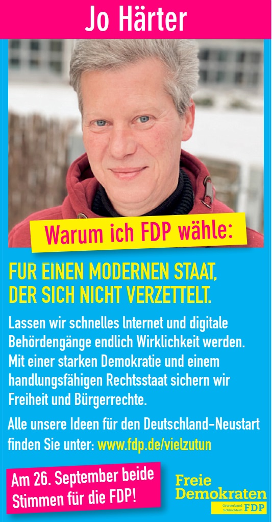 Schlüchtern. „Lassen wir schnelles Internet und digitale Behördengänge endlich Wirklichkeit werden. Mit einer starken Demokratie und einem handlungsfähigen Rechtsstaat sichern wir Freiheit und Bürgerrechte“, fordert Jo Härter und formuliert liberale Positionen zur Bundestagswahl.